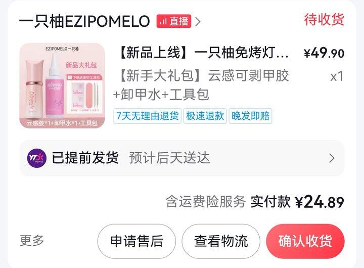 抖音跟着买了一只柚的穿戴甲胶水,是一个群里非常热爱穿戴甲的美术老师推荐的,说免烤灯而且很结实最长可以一个月,最主要儿童孕妇哺乳期都可以用,等手残的我收到试试