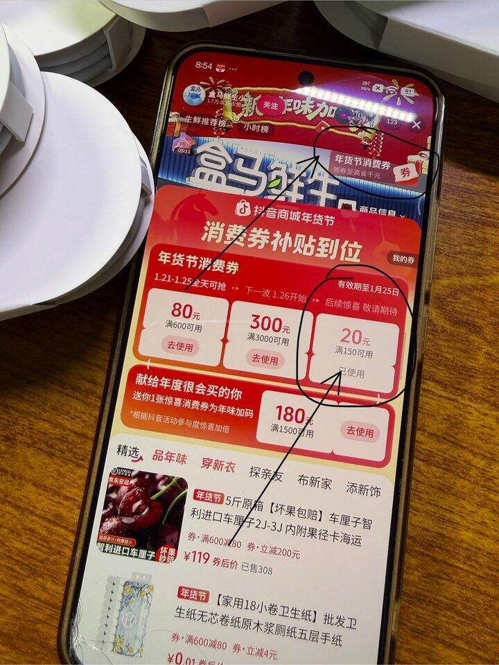现在可以去抖音盒马直播间,点右上角「年货节消费券」,可以得到一个 150-20 的消费券。