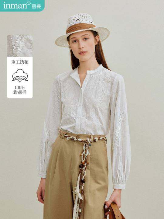 茵曼100棉法式花边立领提花白色衬衫2025秋季女装新款长袖上衣