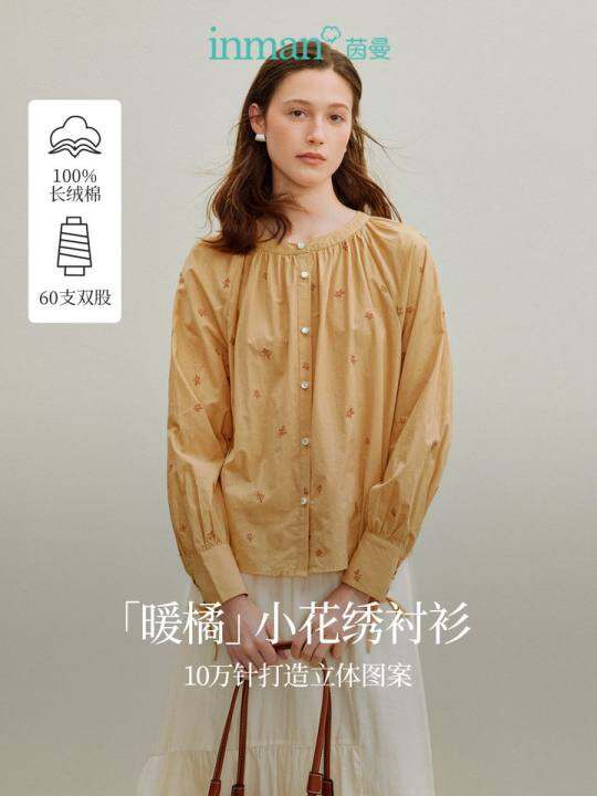 茵曼100棉覆古绑带刺绣衬衫2025秋季女装新款休闲蝙蝠袖衬衣上衣