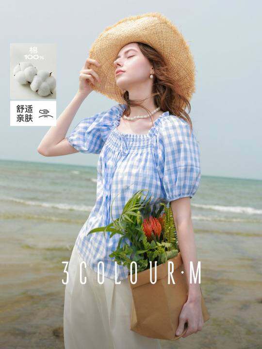 三彩2025夏季新款格纹纯棉衬衣泡泡袖方领短袖上衣宽松两穿M