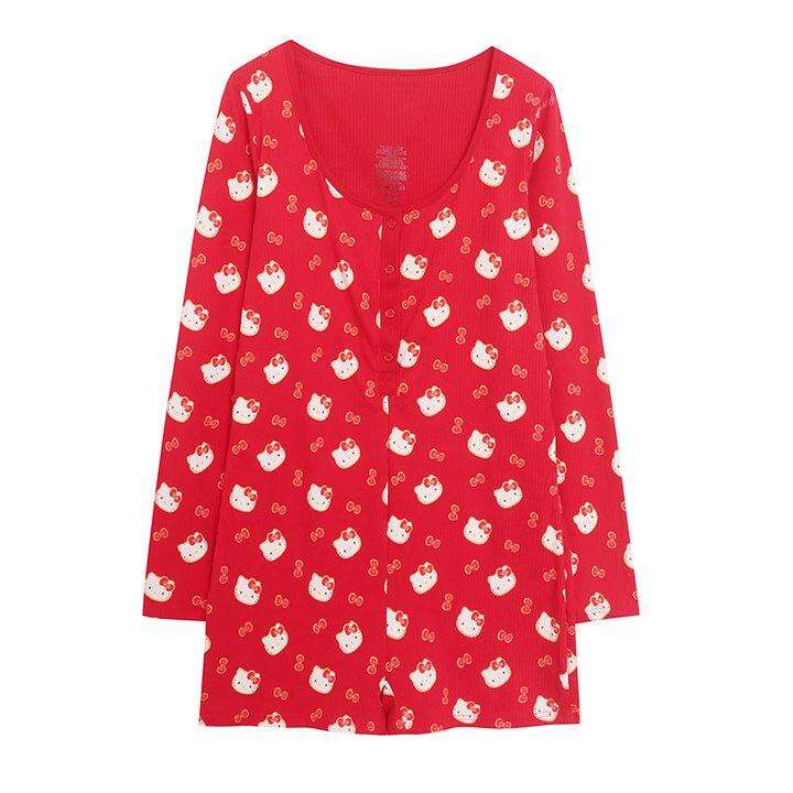 外贸春夏季卡通满印长袖针织打底衫 家居睡衣女士单排扣连体短裤