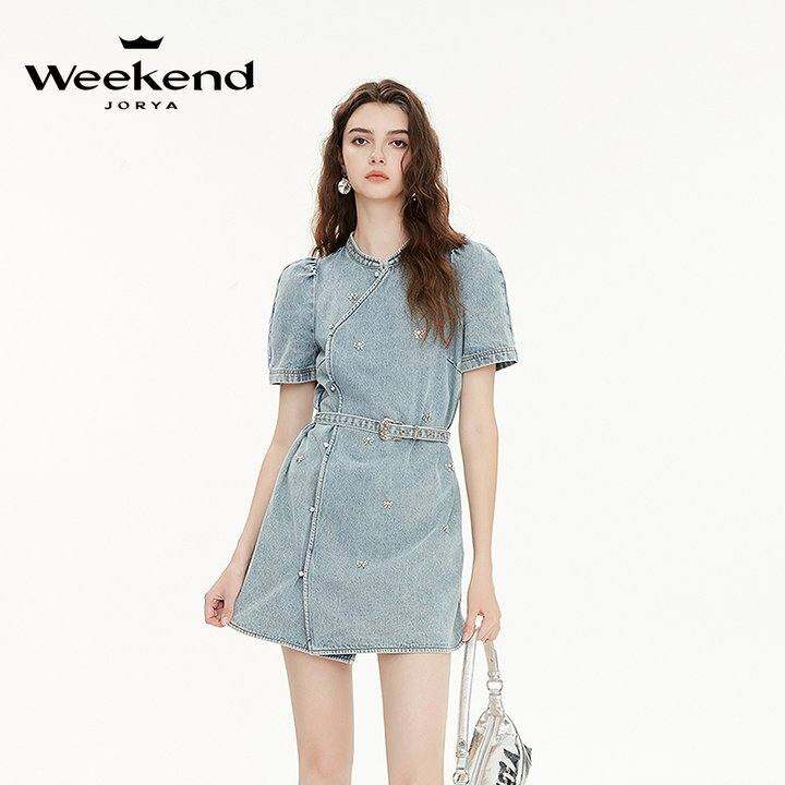 卓雅周末25春季新款新中式立领钉钻蝴蝶结牛仔旗袍连衣裙R200953C