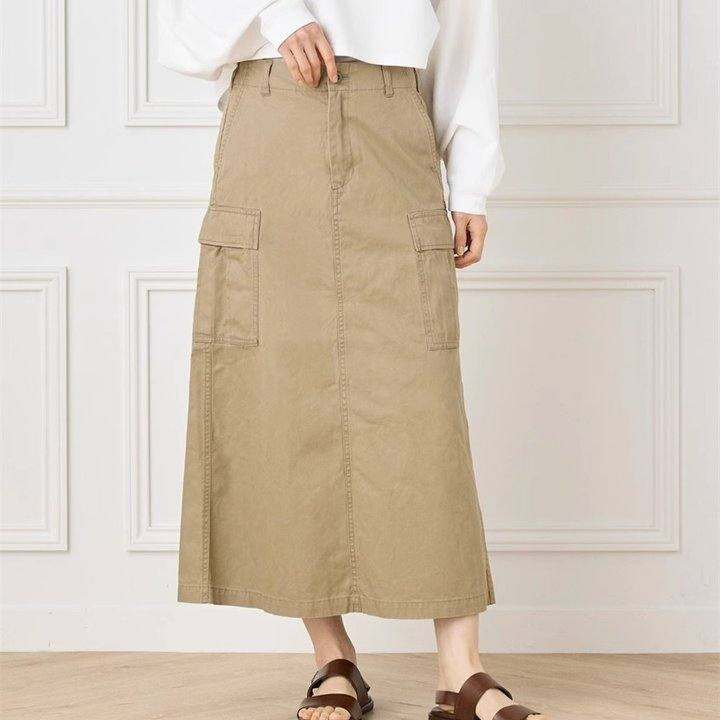 日本 IN*D 柔软骨质纯棉 大口袋 高腰有抽绳 后摆开叉半身裙