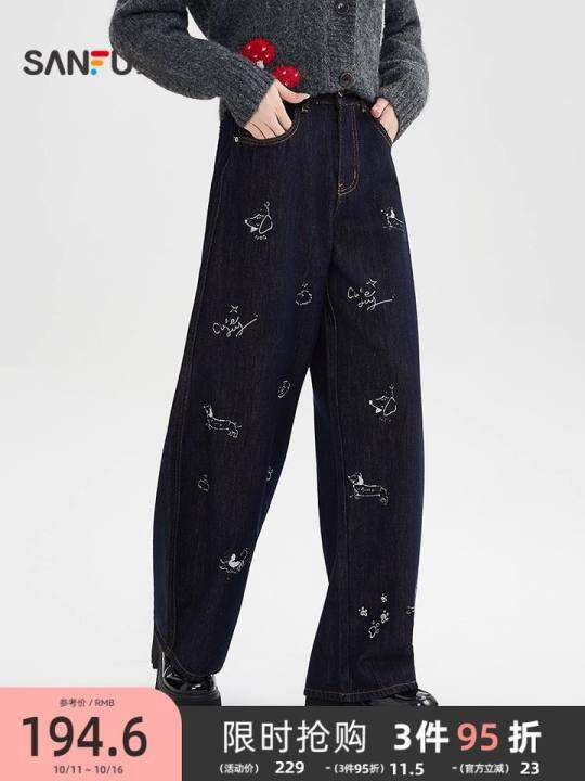 三福牛仔裤2025新款冬季时尚小狗印花宽松深色弯刀裤子女装512069