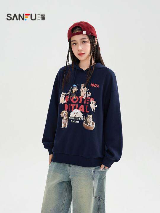 三福连帽卫衣女2025新款冬季可爱猫狗印花宽松灰色上衣女装509948
