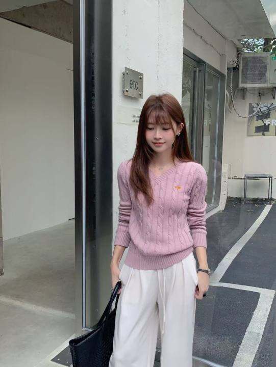 MH 慵懒风刺绣V领紫粉色女款秋冬长袖休闲百搭毛衣女麻花针织上衣