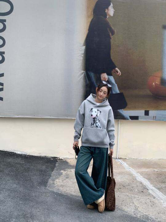 MH美式覆古斑点狗印花连帽卫衣女宽松慵懒风灰色上衣
