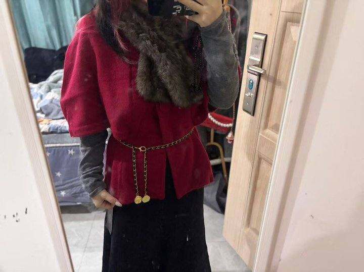 40羊毛,24.6貂绒的斗篷毛衣,自带的毛领是兔毛的,但是我感觉和这个不搭,我自己配的兔毛围巾。到手试穿都是随手一抓的,拍出来效果一般,但是这个挺好看的,材质也不错,有点皱巴熨烫一下比较好,现在穿会冷但是室内拍照没问题,新年&圣诞都合适。去直播间看20分钟可以-5,淘金币再减,我到手68.72。