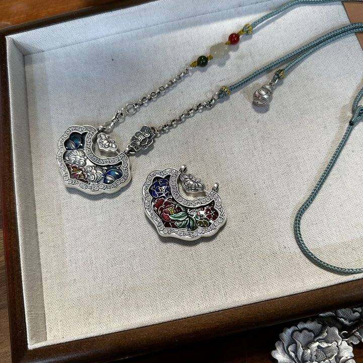 复古风足银999珐琅彩喜鹊莲花锦鲤如意平安锁女士项链时尚百搭款
