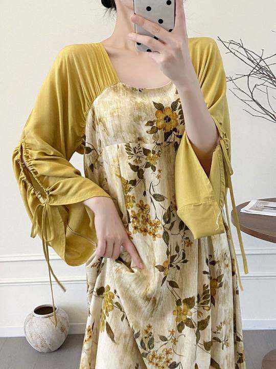 棉绸睡裙春秋新中式度假印花睡裙女夏薄款长袖系带睡裙大码家居服
