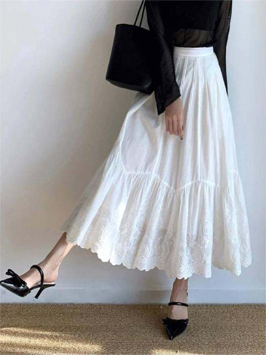 (现货)哇哇太好搭配了!法式绣花棉质花边白色半身裙轻熟风A字裙