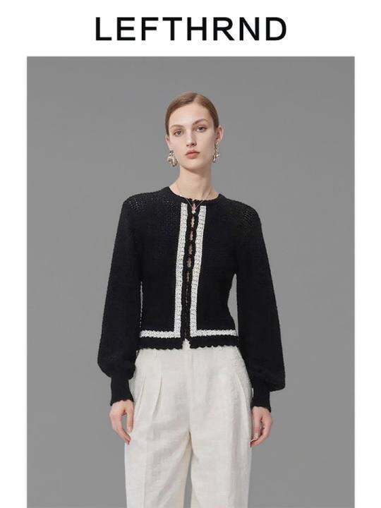 原创小众撞色针织上衣2025女早秋新款高级黑色圆领镂空开衫长袖