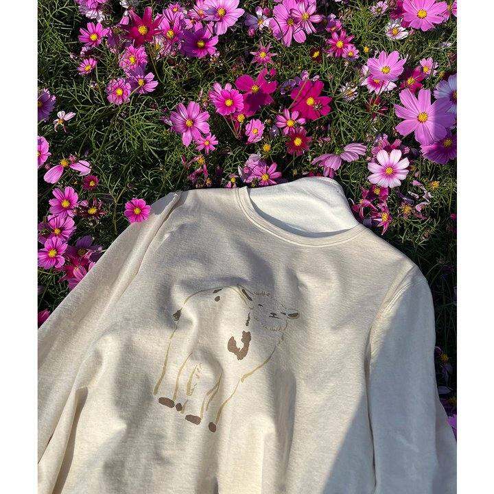 北秋白自制 木棉圆领本色环保长袖T恤 小羊印花/小餐点印花打底衫