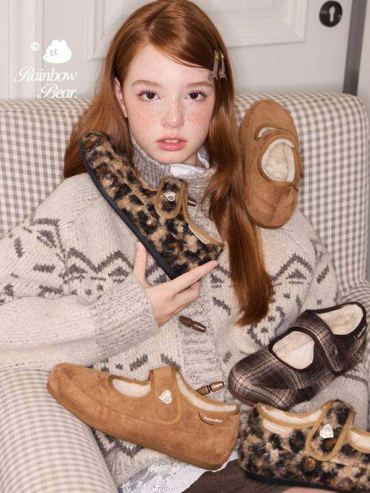 彩虹熊女童豹纹玛丽珍毛毛鞋2025冬季新款儿童棉鞋加绒大童豆豆鞋