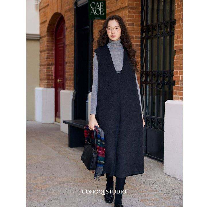从起“伦敦雨”大V领优雅气质无袖花苞式背心裙深灰色连衣裙冬季