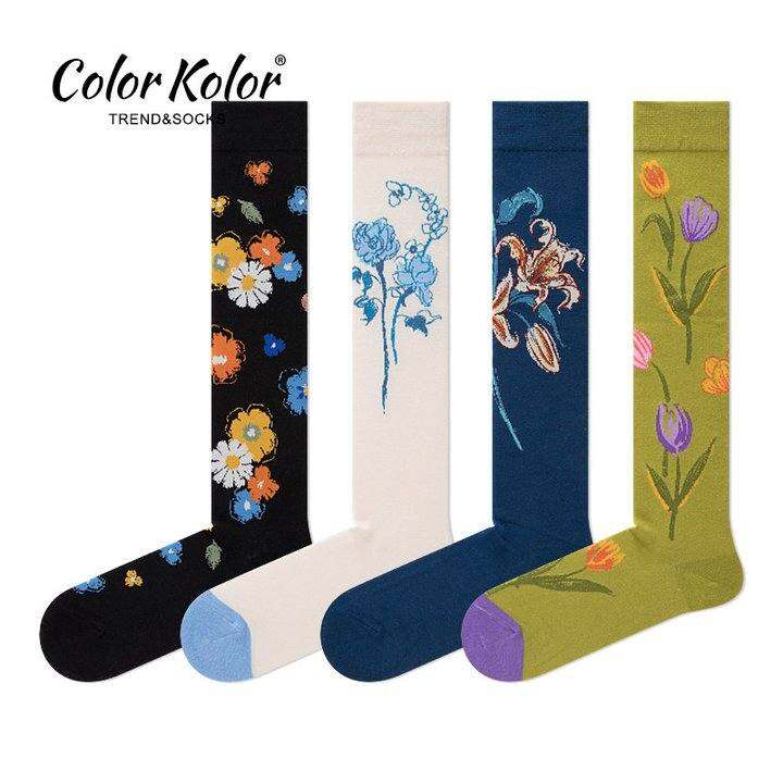 秋冬设计师款雏菊三色堇袜子女长筒小腿袜个性黑色繁花高筒及膝袜