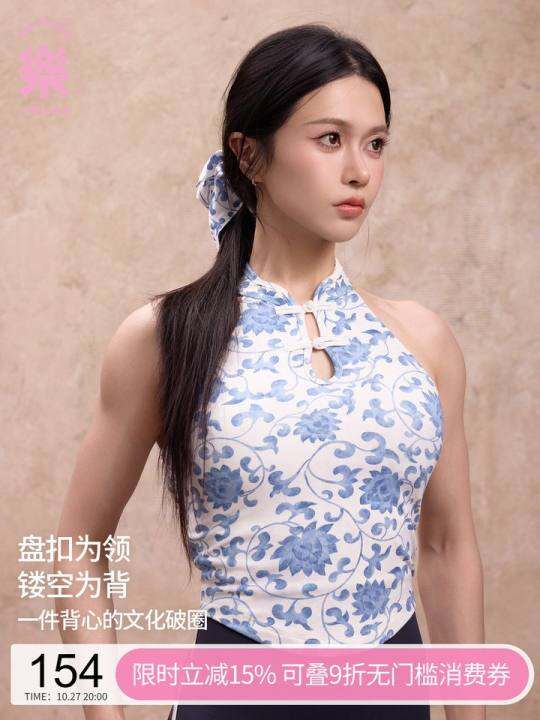 一乐青花瓷·缠枝莲花旗袍领新中式瑜伽背心带胸垫普拉提健身服女
