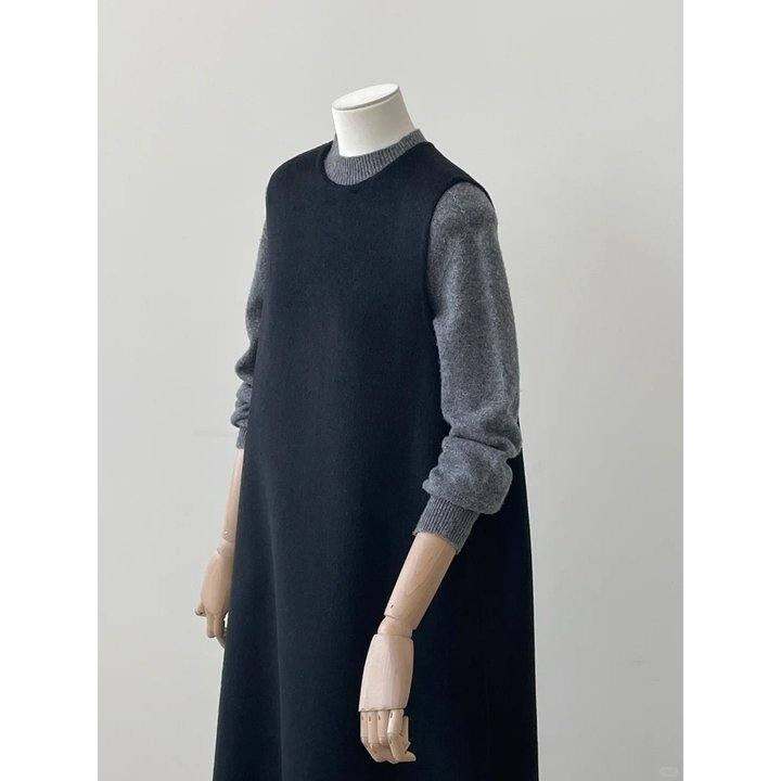 极简高级感黑色羊毛长裙2025秋冬新品双面手缝羊毛套头连衣裙女