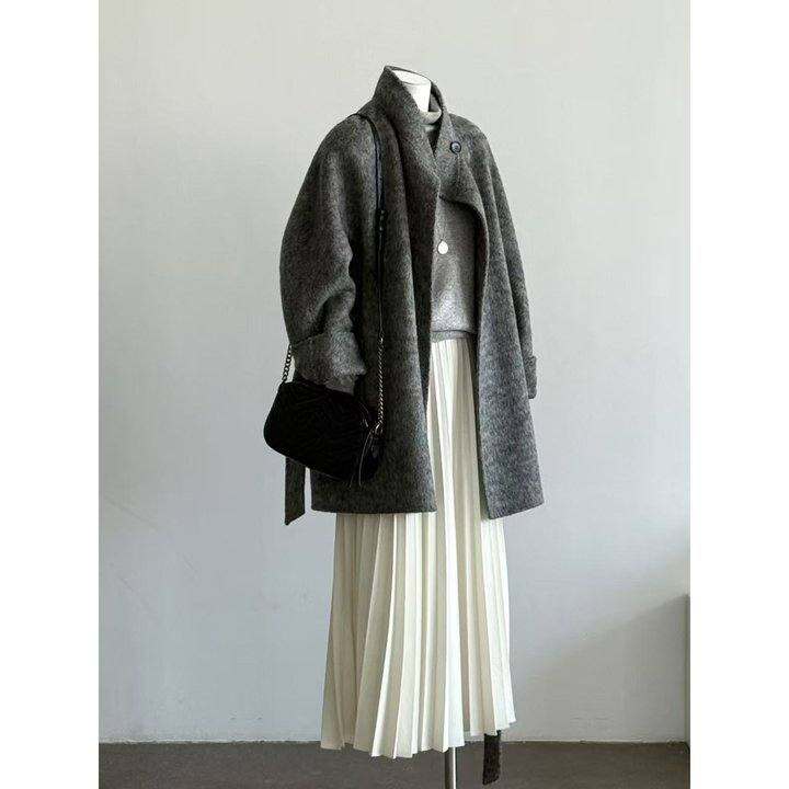 韩系慵懒感~桑蚕丝高货 双面手缝立领羊毛大衣女短款系带羊毛外套
