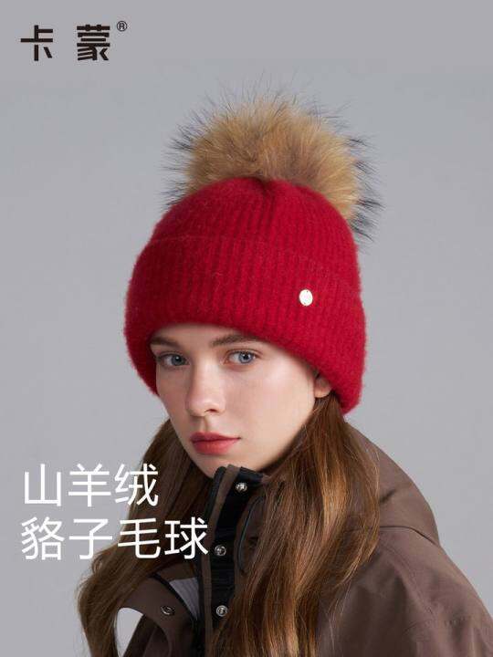 卡蒙秋冬帽子女山羊绒针织帽保暖纯色毛线帽子貉子毛球帽高级红色