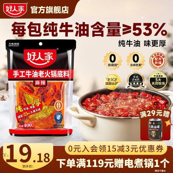 【京东】【16.18】好人家手工牛油火锅底料四川麻辣风味一料多用调味料 纯牛油火锅底料400g【麻辣】: