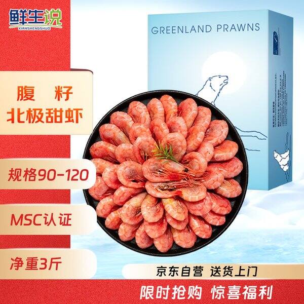 【京东】【79】鲜生说 熟冻带籽北极甜虾 净重3斤/盒 135-180只 海鲜 冰虾: