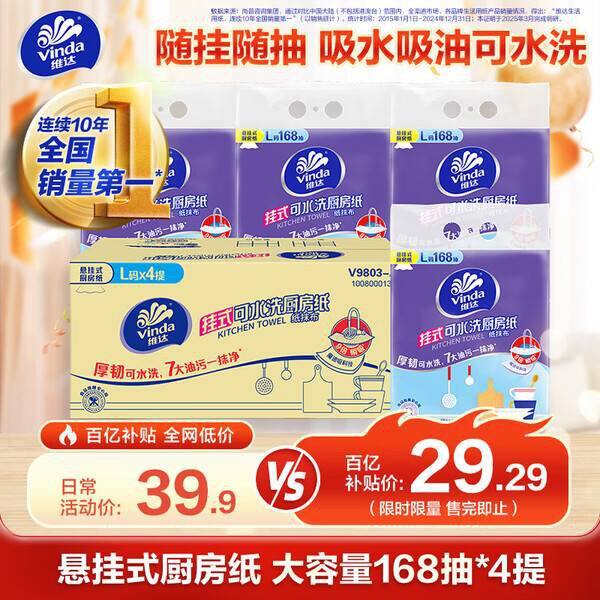 【京东】【24.9】维达(Vinda)厨房用纸 悬挂式抽纸168抽*4提 厚韧可水洗吸油纸 可接触食品级: