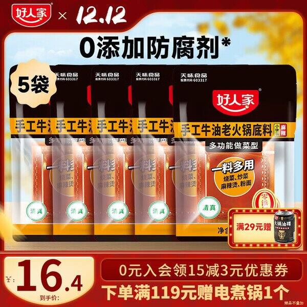【京东】【14.4】好人家0添加香辣牛油火锅底料煮火锅冒菜麻辣烫小块分装露营便携调料 手工火锅50g*5【多用途火锅料】: