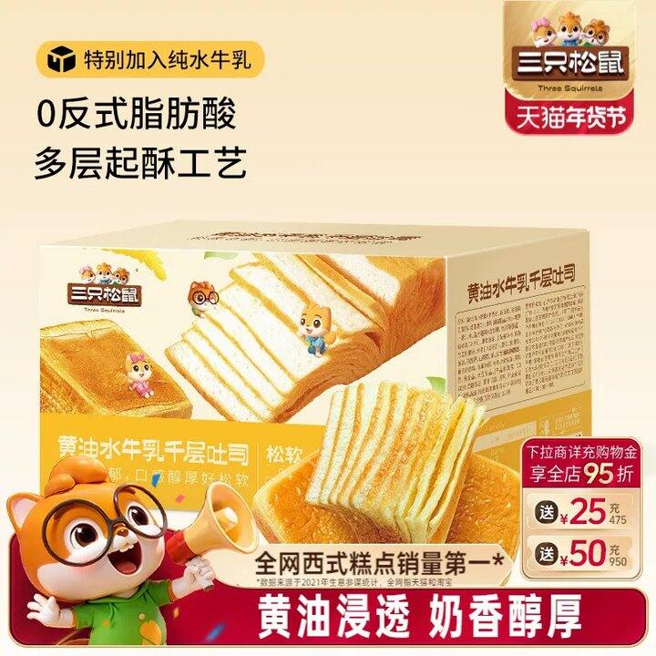 【15.9】三只松鼠_黄油水牛乳千层吐司1kg手撕面包整箱糕点点心水牛奶: