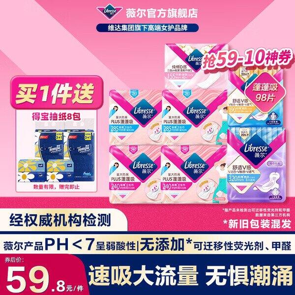 【京东】【49.8】薇尔【优于新国标】量大防漏PLUS蓬蓬吸卫生巾姨妈巾护垫日用夜用套装 超值98片: