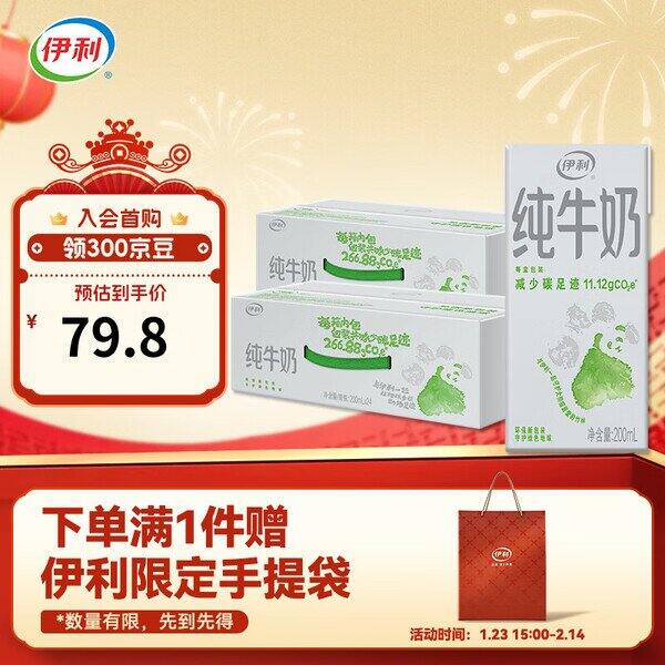 【京东】【59.92】伊利纯牛奶200ml*24盒*2箱 全脂营养乳蛋白 原生营养 减碳环保装 100%生牛乳: