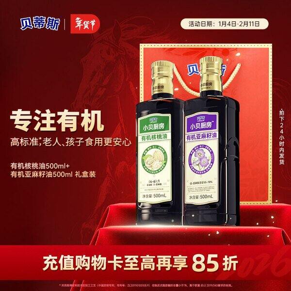 【京东】【89】贝蒂斯小贝厨房有机核桃油+有机亚麻籽油500ML*2年货礼盒装企业福利团购: