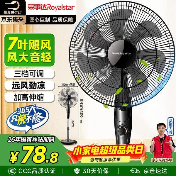 【京东】【78.8】荣事达(Royalstar)电风扇七叶家用摇头落地扇节能电扇宿舍办公室客厅大风量循环扇3档16英寸机械款 FS09-16F1: