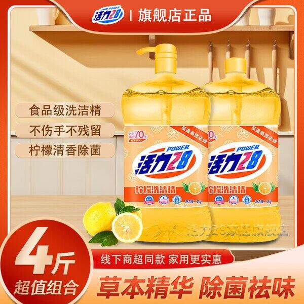 【京东】【14.9】活力28洗洁精洗涤灵柠檬绿茶绿色安全可洗果蔬餐具净不伤手去油无残留 柠檬洗洁精1kg*2:
