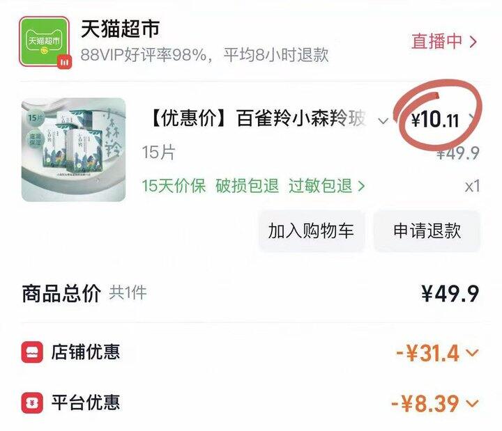 【10.11】百雀羚小森羚玻尿酸补水贴片面膜15片盒装片装随机发: