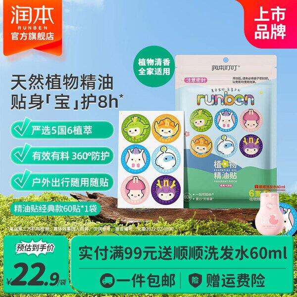 【京东】【15.87】润本叮叮植物精油贴婴儿童专用卡通防护贴成人户外宝宝随身贴 【法国进口原料】经典卡通款 60贴 1袋: