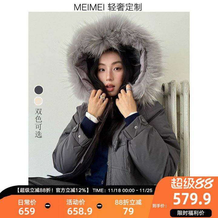 MEIMEI牛角扣羽绒服女冬季加厚长款真貉子毛领新国标90白鸭绒外套