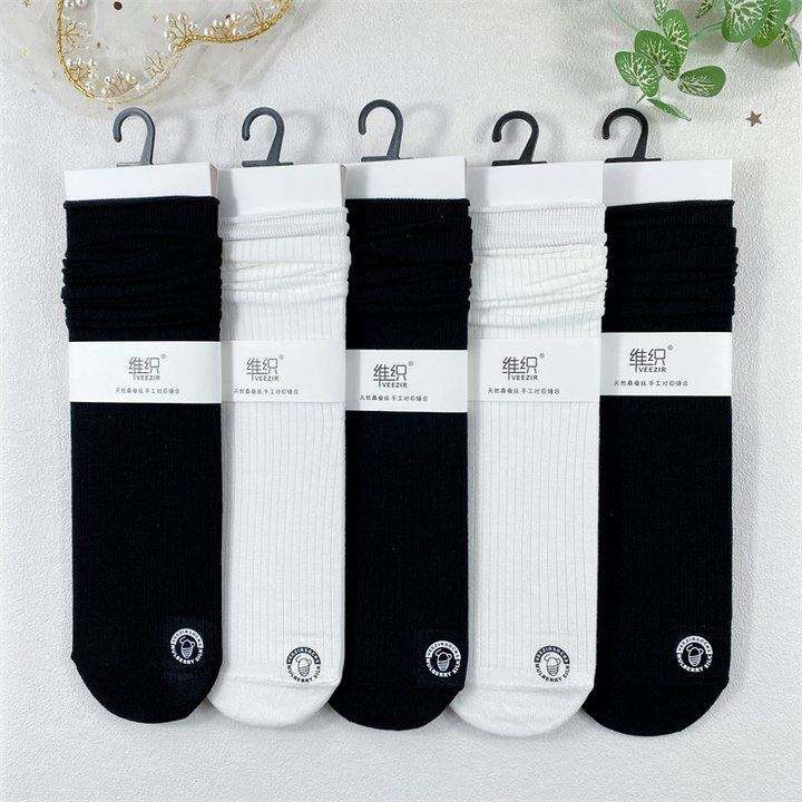 维织女士堆堆袜桑蚕丝春夏薄款中高筒袜子莫代尔黑白学院风卷边袜