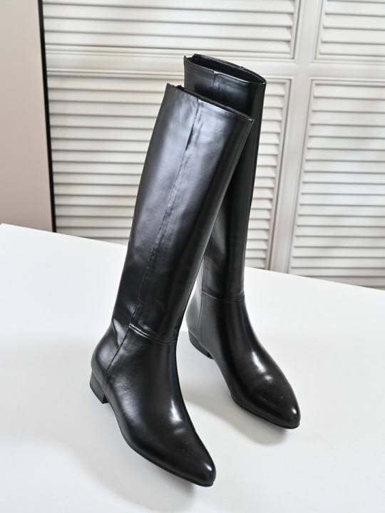 步享~小众覆古牛皮高筒靴女长靴黑色尖头平底低跟真皮时尚骑士靴