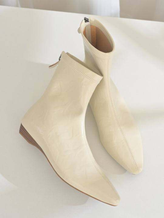 履约~抓纹皮弹力靴短靴女软底白色通勤尖头平底真皮百搭瘦瘦靴子