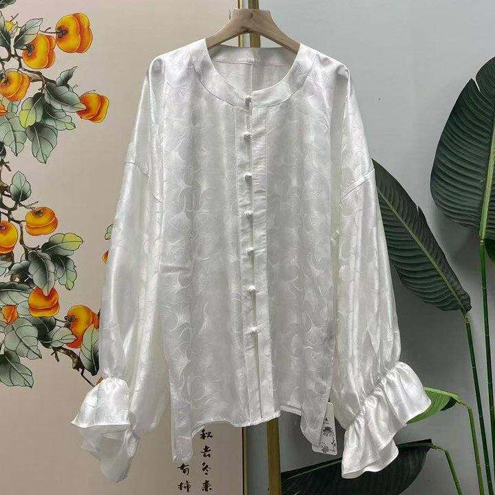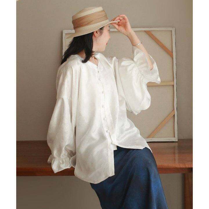 预九条蚕100桑蚕丝26姆米花萝大灯笼袖衬衫宽松长袖上衣女