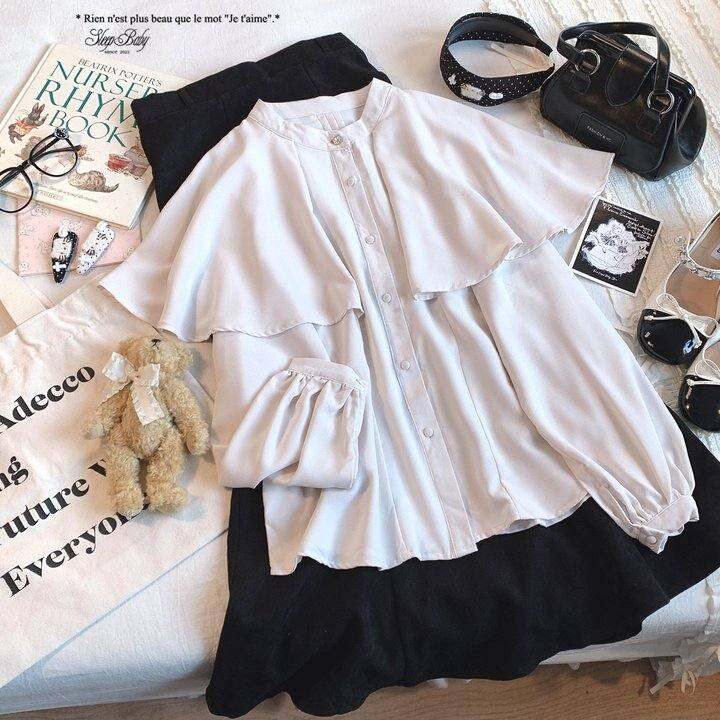 日单 立领斗篷感荷叶边清楚系优雅覆古百搭雪纺衬衫