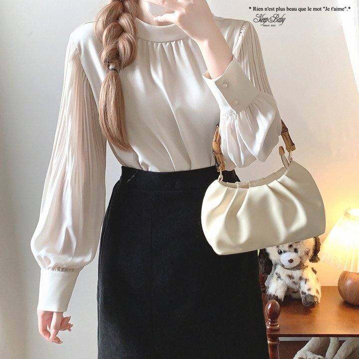 日单 日系温柔通勤风立领风琴褶长袖覆古清楚系雪纺衬衫