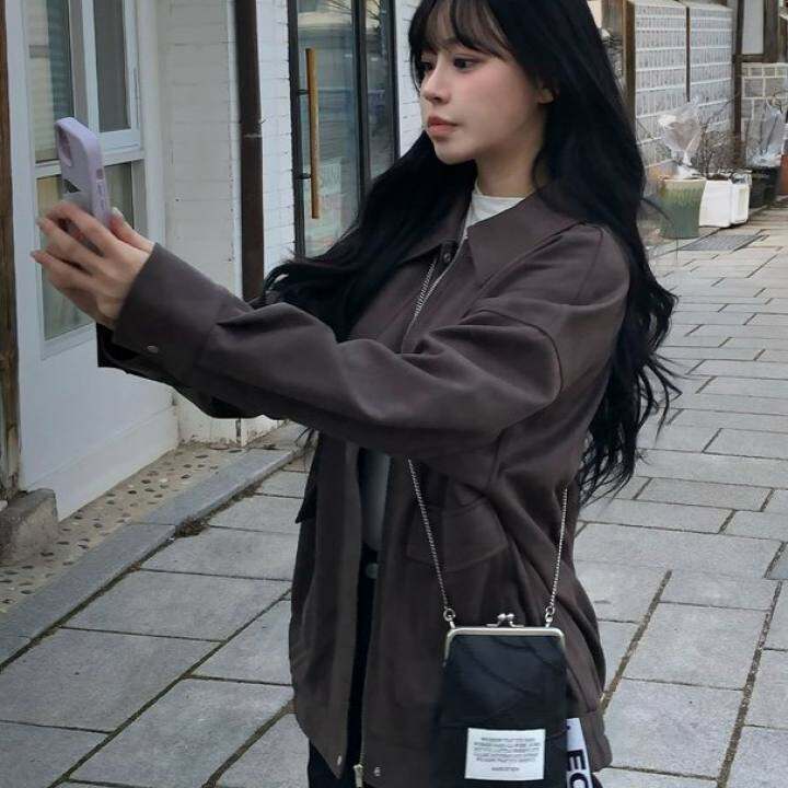 D17023日单新款按扣拉链翻边领宽松显瘦女纯色通勤休闲麂皮绒外套