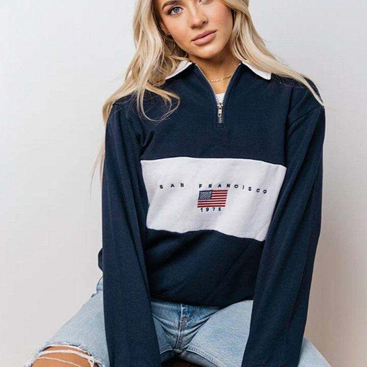 小武出品米国刺绣春秋季翻领半拉链加绒卫衣女休闲宽松落肩袖外套