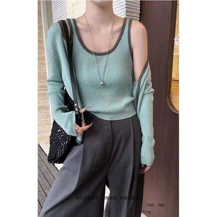 2025初秋女款通勤针织两件套拼色吊带背心+长袖开衫外套薄款上衣