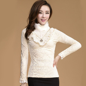韩版T恤蕾丝加绒加厚上衣兔毛保暖打底衫