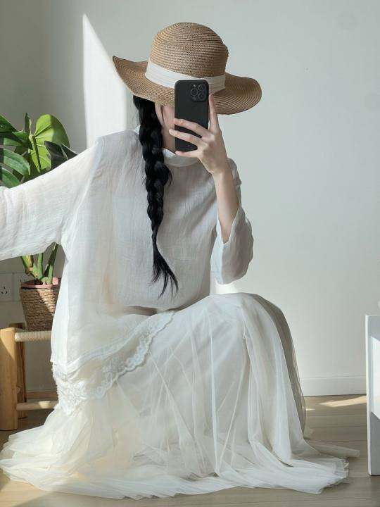 沐山也 梨花 新品甜美蕾丝拼接苎麻百搭正反可穿刺绣圆领上衣