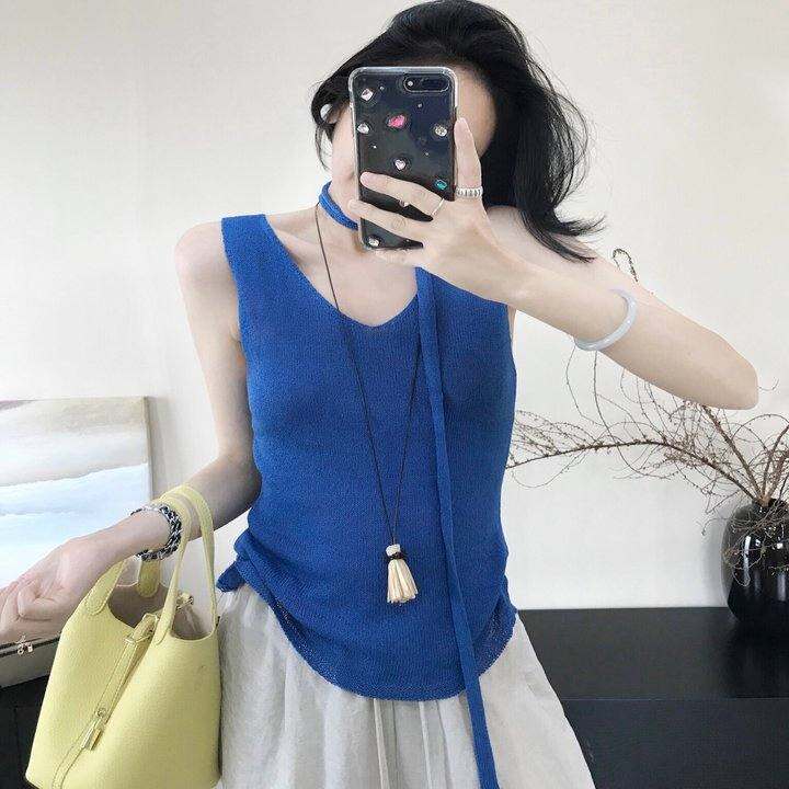 【大萌家】娇娇韩女 乖甜设计感温柔飘带v领无袖针织衫粗针背心